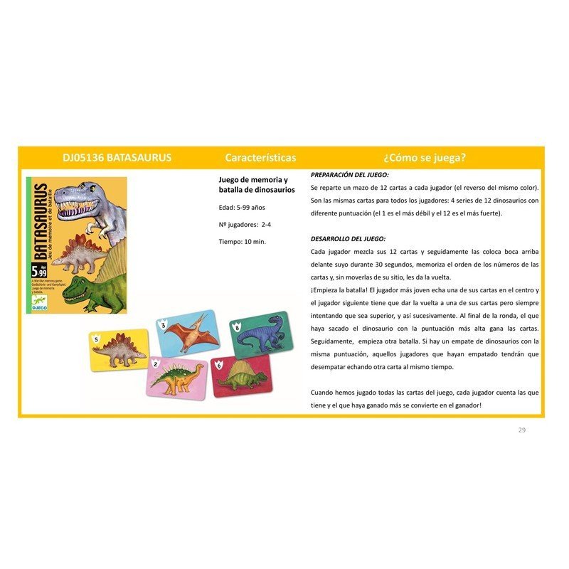 Un juego de memoria en forma de batalla. En lugar de tener las cartas en la mano, las cartas se colocan boca abajo sobre la mesa. ¡Solo se tienen unos segundos para memorizar su lugar antes de que arranque el combate de dinosaurios! 1, 2 y 3: cada jugador le da la vuelta a una de sus cartas y la carta más alta gana la baza. ¡Los jugadores pueden elegir qué carta usar y ganar la baza, pero para ello deben recordar el lugar que ocupan sus dinosaurios! ¡El jugador que haya ganado más cartas gana la partida! Hay 12 cartas de dinosaurios para memorizar, con fuerzas numeradas del 1 al 12. Un juego de batalla inédito que requiere ejercitar la memoria. Ilustraciones para descubrir diferentes especies de dinosaurios. Una caja compacta, que se puede llevar a todas partes. Cartas de calidad y resistentes.